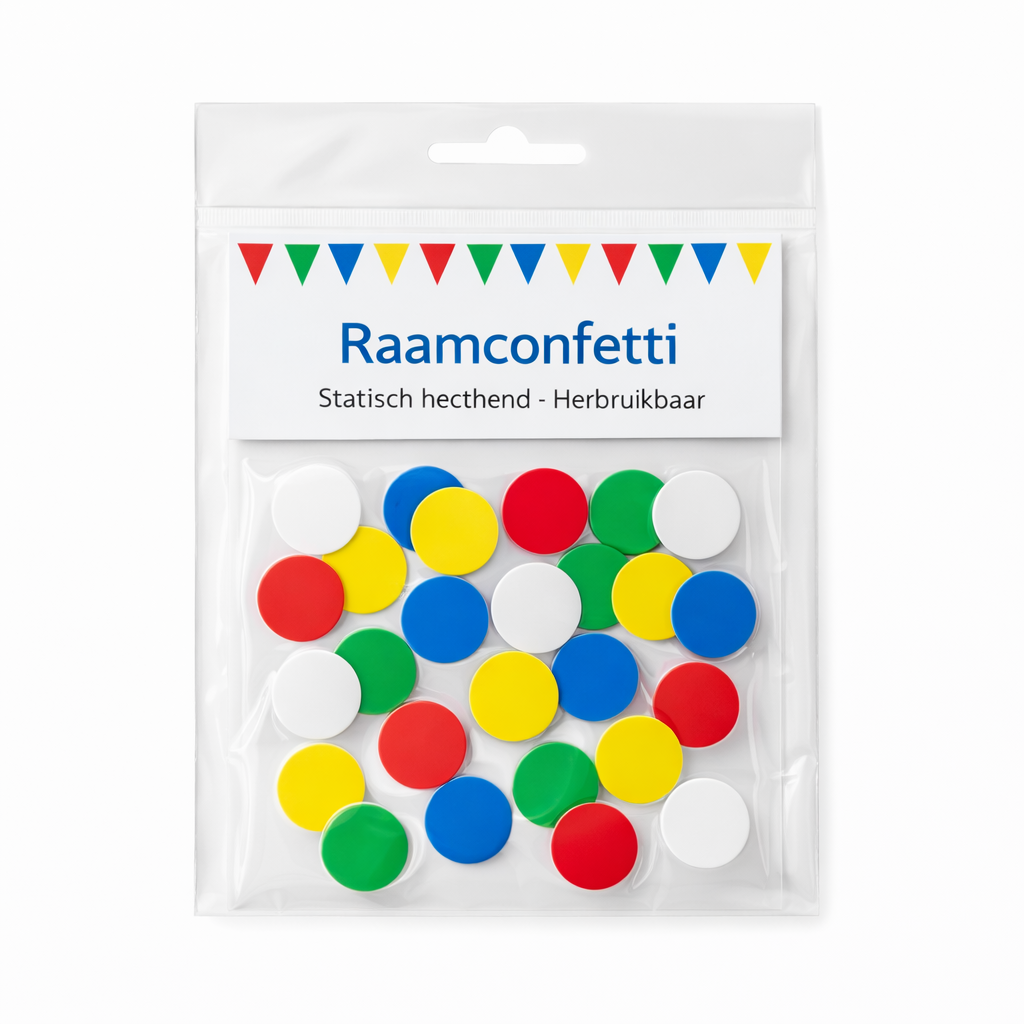 Breng in een handomdraai kleur, vrolijkheid en feestgevoel op je ramen met deze statisch hechtende raamconfetti! Of je nu carnaval viert, een feestje organiseert of gewoon zin hebt in wat extra gezelligheid in huis: met deze confetti creรซer je direct een vrolijke sfeer. De raamconfetti hecht zonder lijm aan gladde oppervlakken zoals ramen en spiegels. Hierdoor laat het geen lijmresten achter en kun je de confetti eenvoudig verwijderen, verplaatsen en opnieuw gebruiken. In รฉรฉn verpakking ontvang je een mooie kleurenmix van rood, blauw, geel, groen en wit. Na gebruik berg je de raamconfetti eenvoudig weer op in het zakje. Let op: de getoonde verpakking is een sfeerimpressie. De daadwerkelijke verpakking kan er iets anders uitzien.