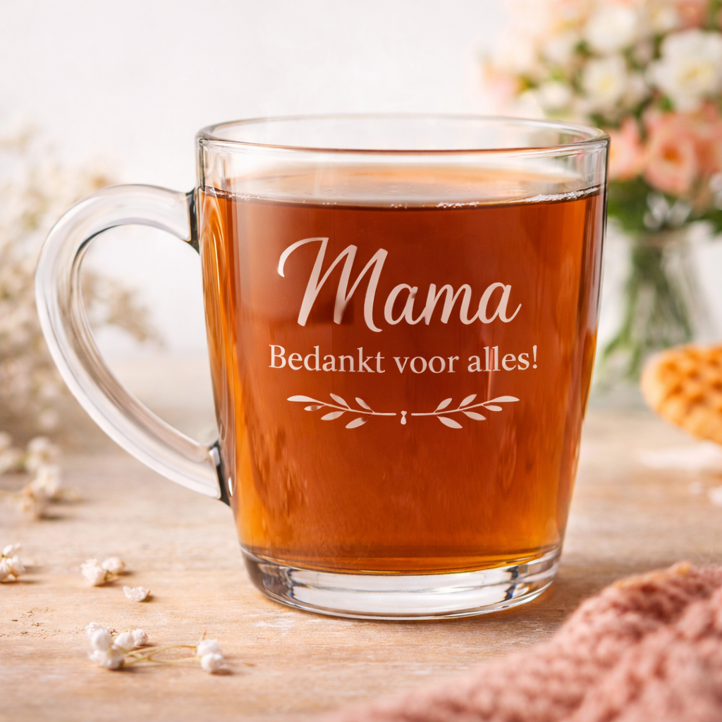 Een persoonlijk gegraveerd theeglas is een warm en origineel cadeau voor een verjaardag, housewarming, Moederdag of als bedankje. Voeg een naam of korte tekst toe en maak van elk theemoment iets persoonlijks en bijzonders.