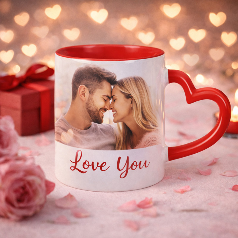 Op zoek naar een romantisch cadeau dat écht binnenkomt? Deze hartjesmok met rode binnenkant en rood hartoor is een echte eyecatcher. Zet jullie favoriete foto erop, voeg een lieve tekst toe en maak een mok die elke dag herinnert aan jullie moment.